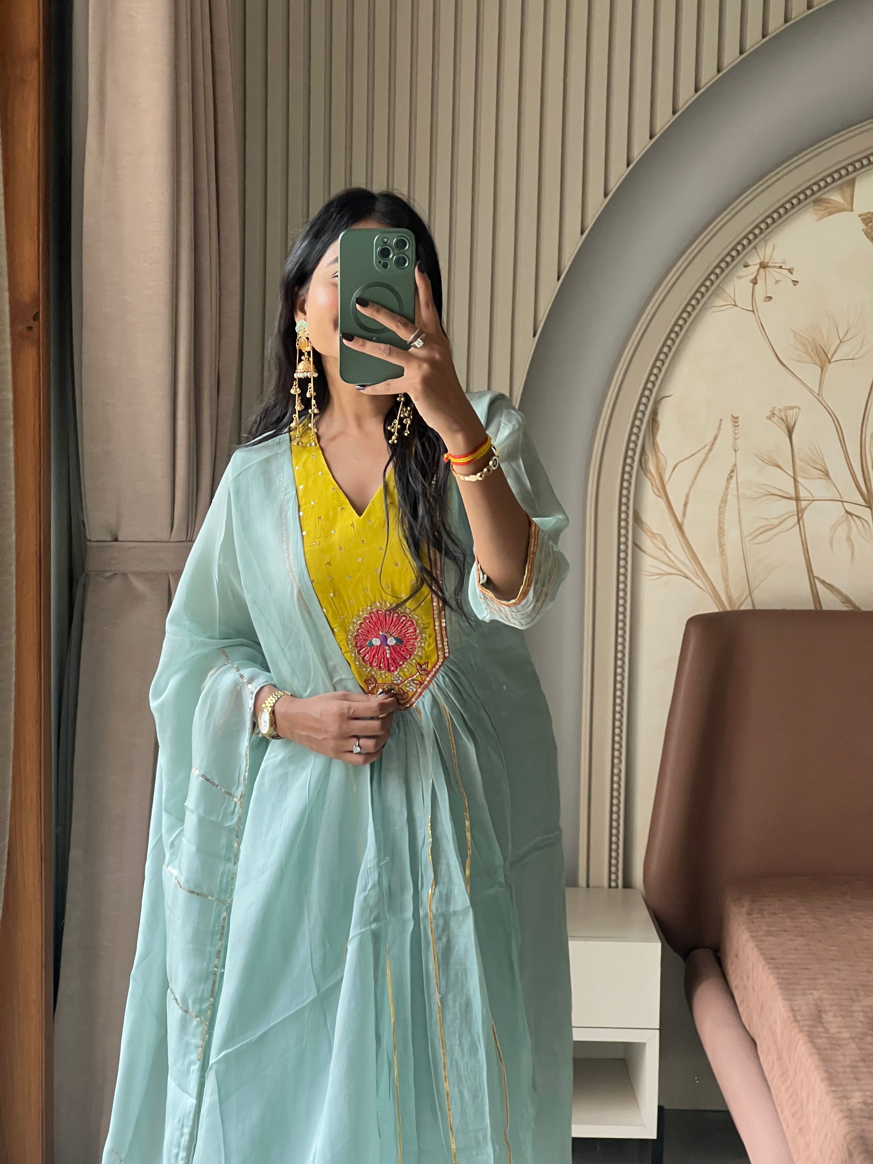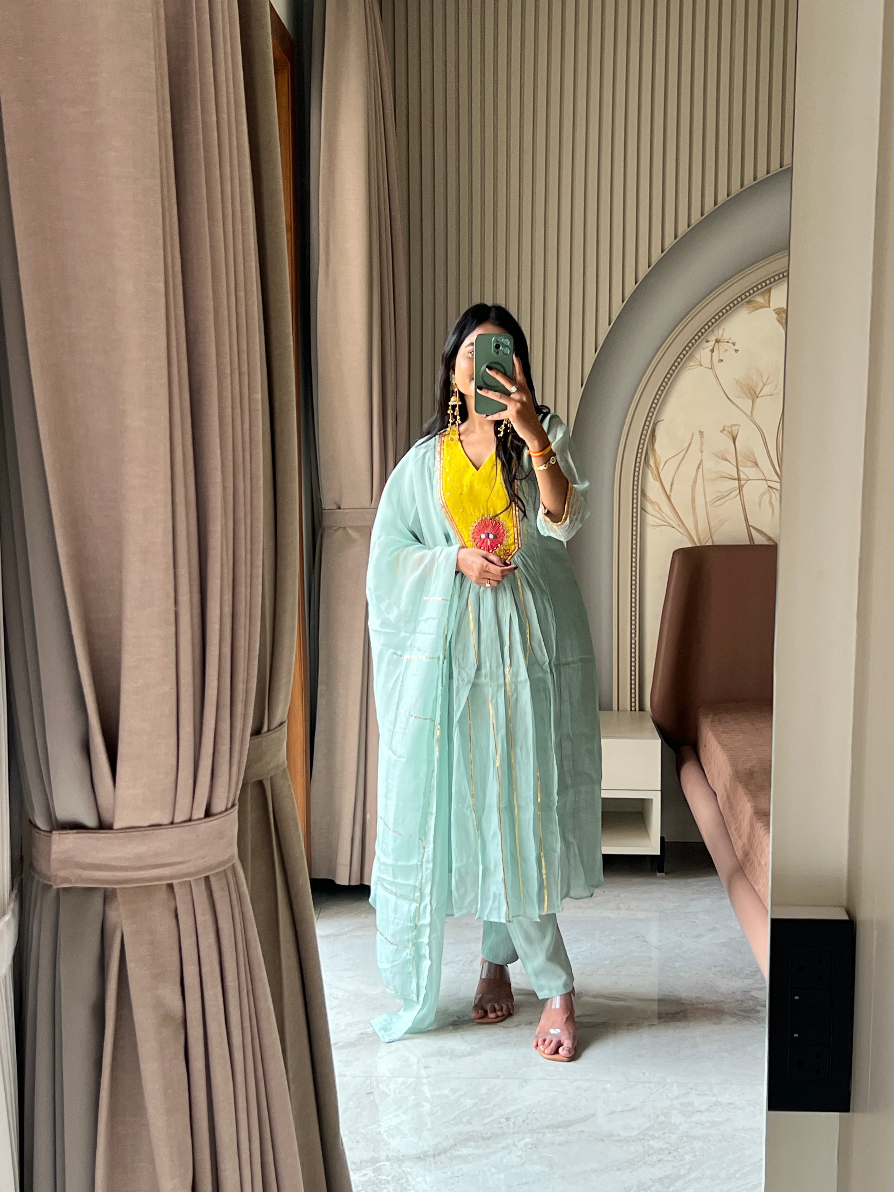 Sky Mul chanderi suit set with beautiful hand embroidery