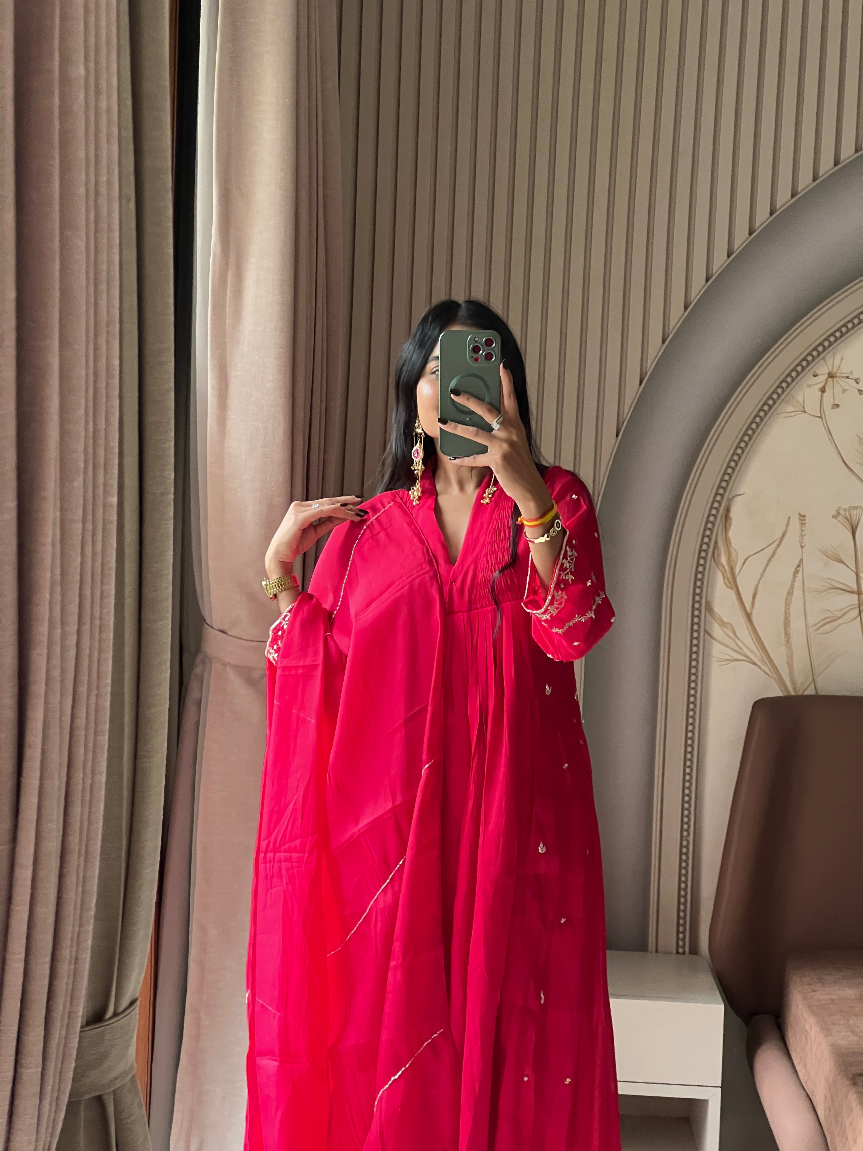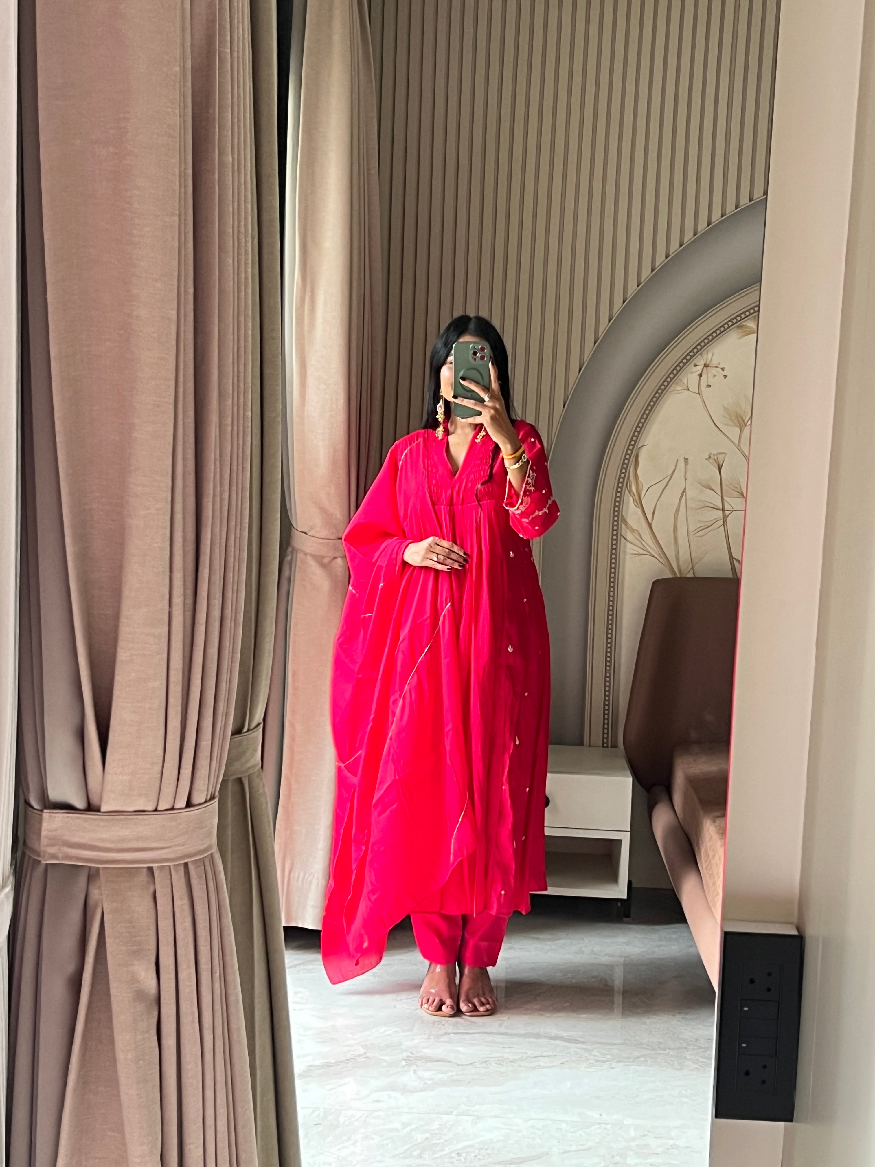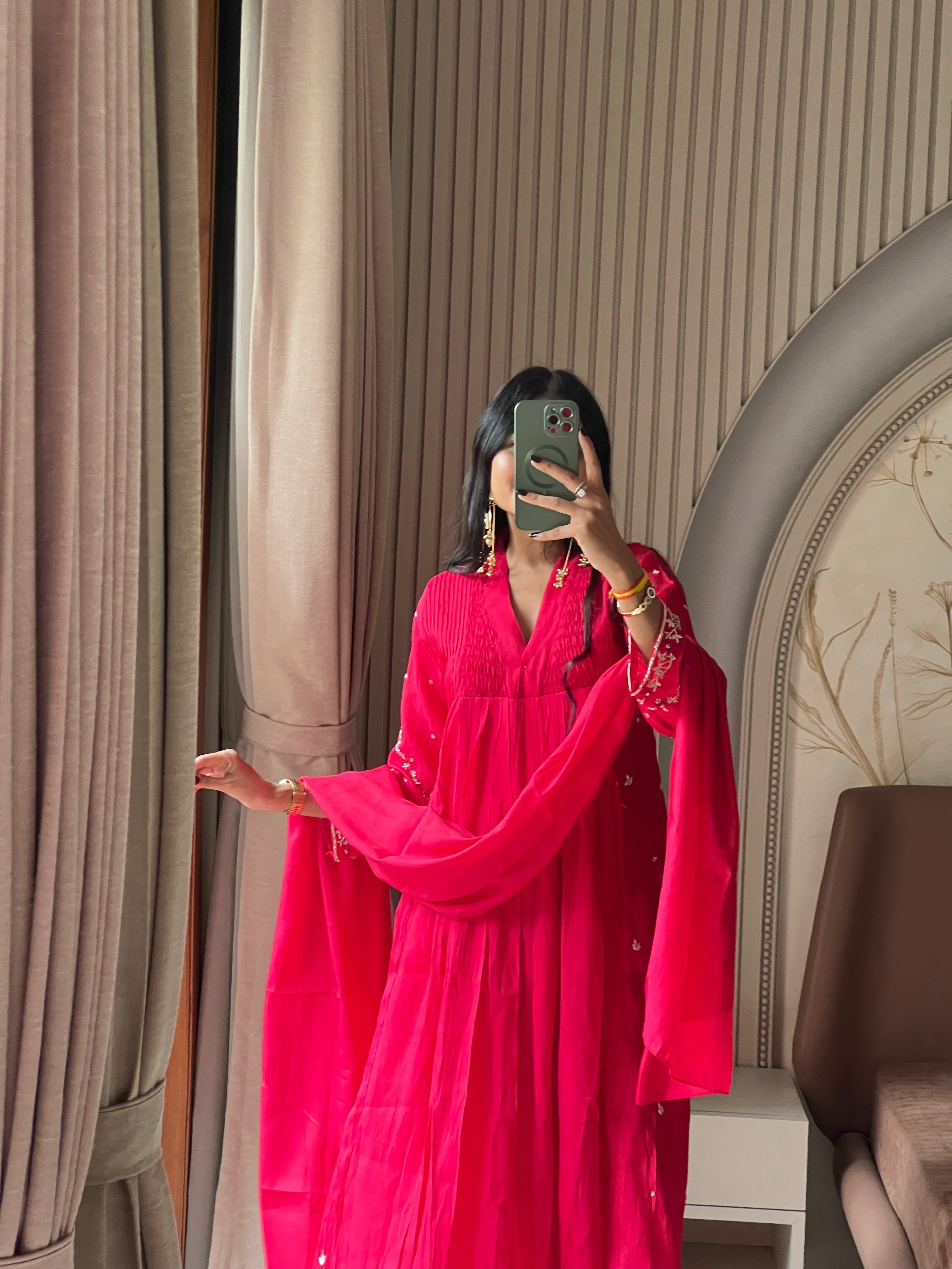 Hot pink kurti set with beautiful sleeves work Hot pink kurti set with beautiful sleeves work